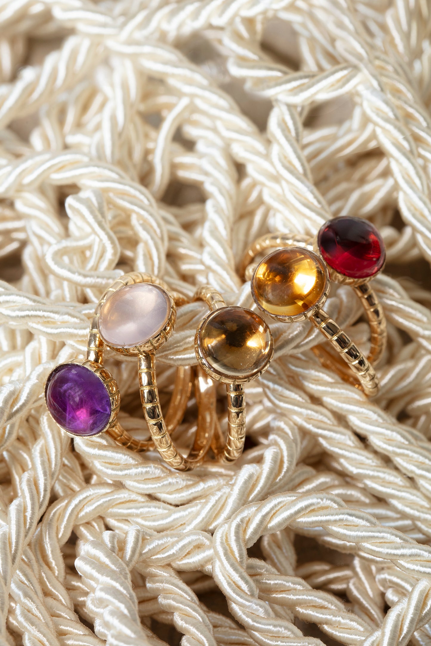 Le travail des orfèvres de la Maison familiale nous a inspiré ce motif de cannelures en or retrouvé sur la bague Roxane, les pendentifs Juliette et les créoles Jeanne.