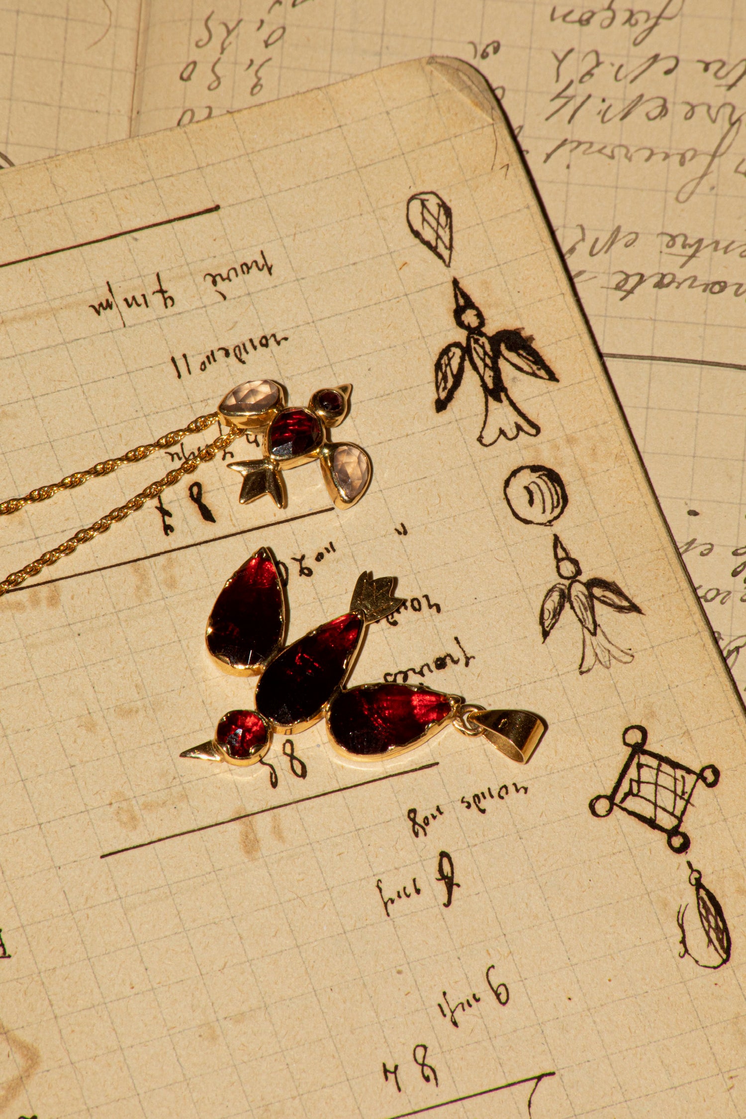 Bijou du siècle dernier, le pendentif Charpentier en grenat, représentant un oiseau lumineux et plein de caractère est devenu notre pendentif Louise, reinterprétation plus légère et aux couleurs nuancées.